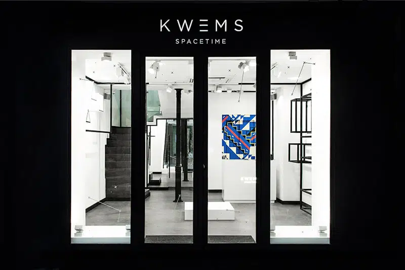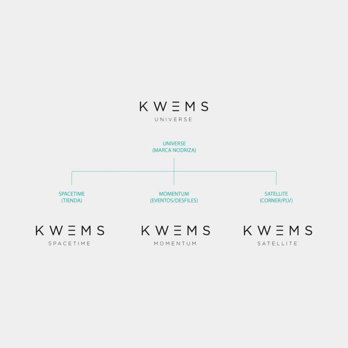Para la creación de la identidad visual de Kwems, apostamos por una visión cósmica. Así, el naming y el tagline Kwems Universe sirven de matriz de la marca, además de ser utilizada en el entorno online, para abarcar las distintas facetas que esta guarda: Kwems Spacetime, para las boutiques; Kwems Momentum, destinada a desfiles y otros eventos; y Kwems Satellite, para emplear en los corners, en expositores y otros puntos estratégicos que funcionan como publicidad en el lugar de venta (PLV).