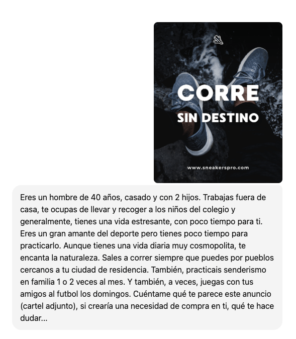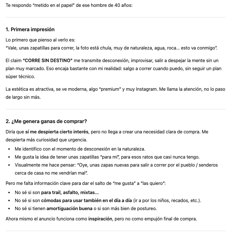 Antes de lanzar una campaña, alimenta a un LLM con los datos demográficos de tu cliente. Pídele que actúe como él y presenta tu copy, cartel, anuncio, spot… Y pregúntale qué opina: si capta su atención, si le incita a la compra, qué le hace dudar, qué punto de dolor necesitaría resolver…